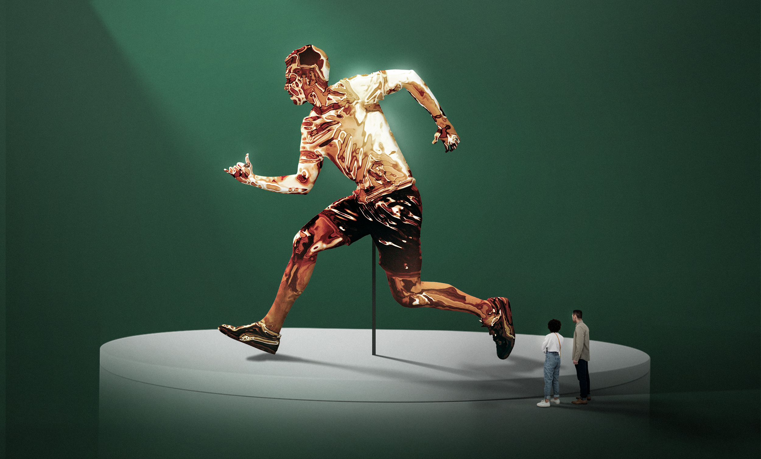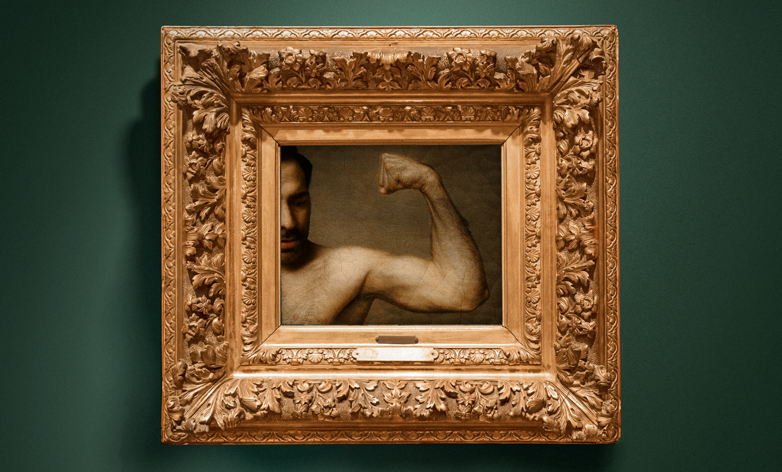 The body is a masterpiece, yet doesn't always garner the attention it deserves. Reframing the body as a work of art, viewers are invited to marvel at sculptures, paintings, and busts as if walking through a curated museum collection. In a meta-level take, the viewer can see themselves in the art both literally and metaphorically. Space is played with carefully and intentionally here. For instance, the man stands towering above a fragmented bust of himself, smiling subtly at the creation and quite literally taking the place as the brains behind the work. Several different styles of art are represented, evoking the multifaceted aspects of the body's distinctness. A bicep is best captured by an oil painting, whereas the enormousness of a head is abstractly displayed like a modern art piece.