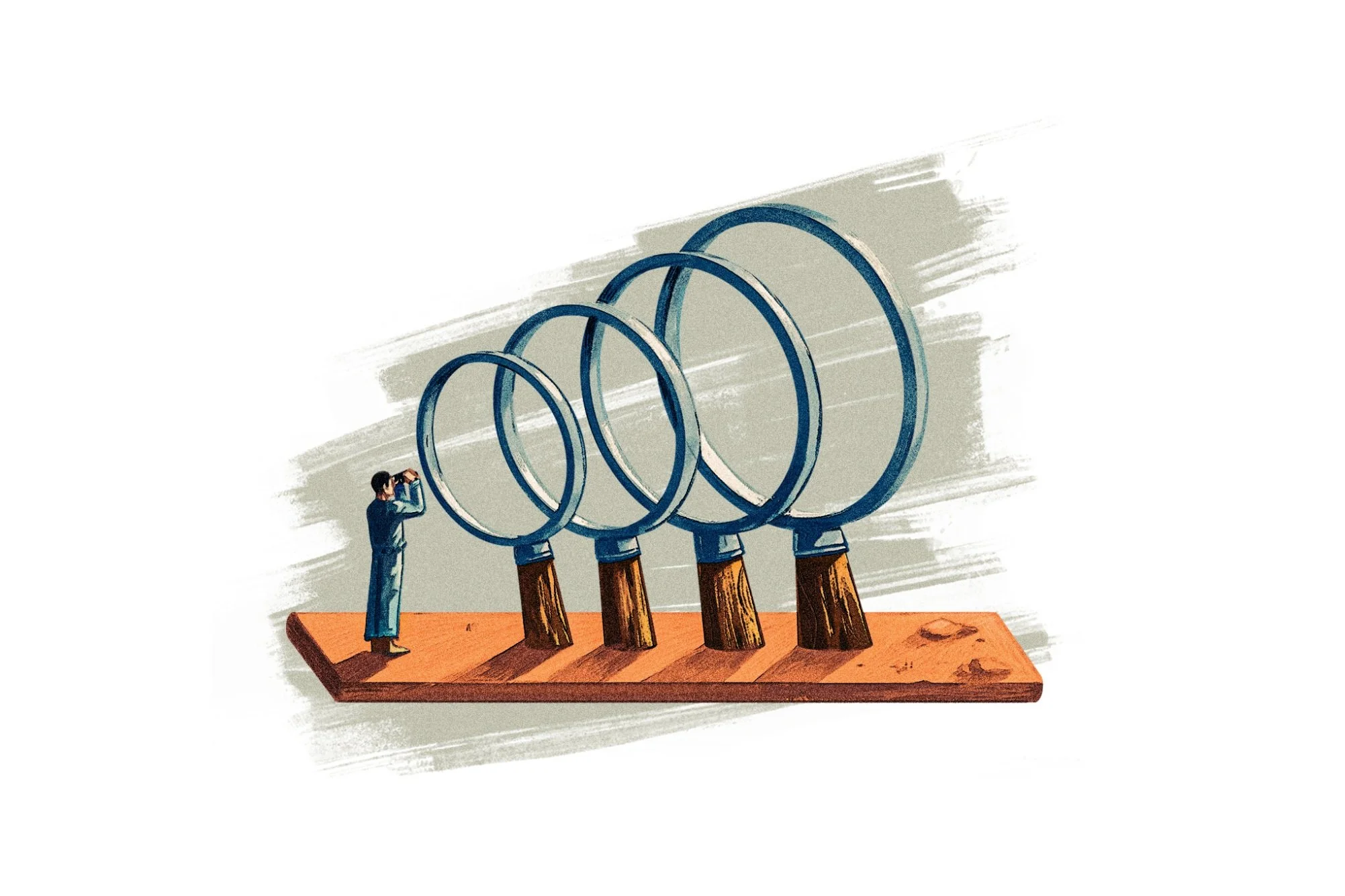 The first image imagines the quest for truth like an archaeological excavation. As the man chisels through a thick layer of rock, more clarity is availed to him. In this massive book excavation, he gets closer to truth with every bit of knowledge attained. The second image reinforces the idea that we need several layers of magnification to (try to) understand something. The man "magnifies the magnified" to hone deeper and deeper truth. The third set of images point back to traditional derivatives of truth: research, science, law, and justice.